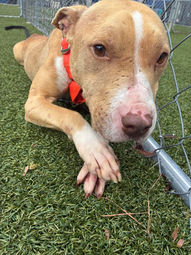 Foster Update Mar 23, 2023: She is crate trained and housebroken. She loves to play outside. She enjoys her toys. She doesn't bark very often at all except when she gets excited while playing or when her foster arrives home from work. She is good on leash. She rides good in the car. No cats please; she's too curious about them. While her current foster home has no other pets, Carmella does like other dogs. Laid-back dogs with spurts of playful energy that like to bask in the sun are Carmella's speed. Carmella loves attention and absolutely adores her humans. She will often choose to sit by her human to get belly rubs rather than running and playing with other dogs.