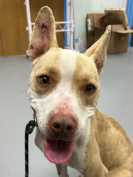 10/24/25 Intake: terrier mix, 50.4 lbs, 1 yr old, male, HW+, owner surrender. King was surrendered by his owner, because they can no longer afford to take care of him. He is heartworm positive.