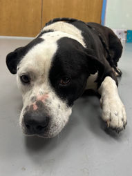 2/14/25 Intake: terrier mix, 68 lbs, 1.5 yrs old, male, HW-, stray. Hunk was brought in as a stray by animal control from Oates Hy in Lamar. His name is Hunk, because he is almost 70lbs of kisses and snuggles. He did great for intake!! Hunk is heartworm negative.