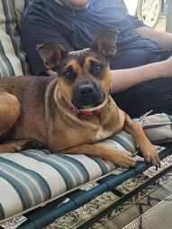 Foster Update Nov 16, 2025: "Pinky is a playful but very sweet and submissive girl. She is smart, crate trained, house trained, and great with other dogs. She loves relaxing on the couch with her favorite toy or laying in the sun. She’s an easy foster and a loving companion who will fit right in with any family." Love, Pinky's foster dad.