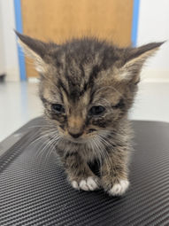 10/16/25 Intake: domestic short hair, 1.8 lbs, 7 wks old, male, stray. Stabler was brought in as a stray by a community member from McIver Rd in Darlington.