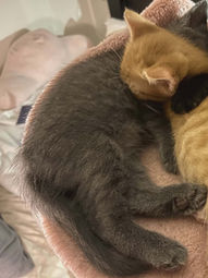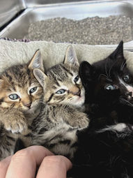 4/6/26 Intake: domestic short hair, 1.15 - 1.39 lbs, 5 wks old (available after 4/27/26), strays. Zx3 kittens were brought in as strays by animal control from Broach St in Hartsville after being found in a barn. Zig (male), Zag (male), Zoom (male).